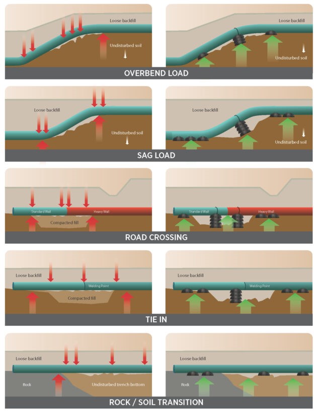One easy solution is the use of structured pipeline pillows (SPP) such as PipePillo® Structured Pipeline Supports. PipePillo® is an engineered support designed as an in-trench, long-term solution for pipeline support. PipePillos® were initially developed as an engineered replacement to foam and sandbags for inch pipeline support in areas of stone and rock.